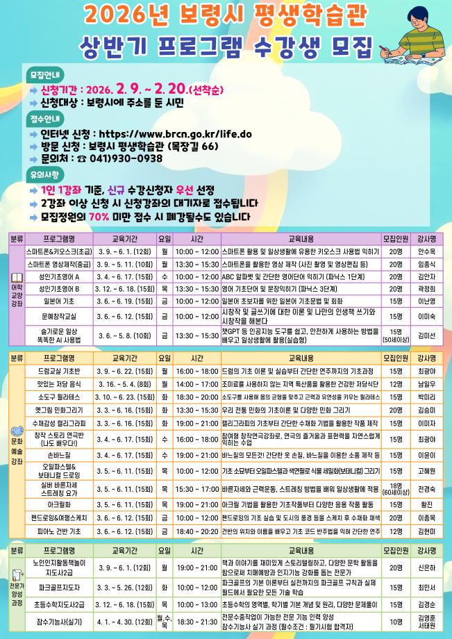 | 제목 | 2026년 상반기 보령시평생학습관 프로그램 수강생 모집 | ||||